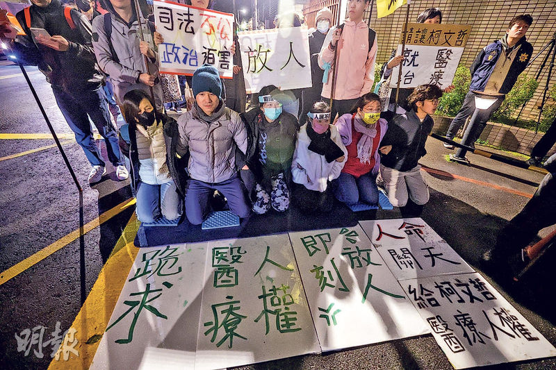 【明報專訊】台北前市長、民眾黨前主席柯文哲上周六(29日)晚間身體不適,因屬健康高風險個案,台北看守所派員戒護外醫,當晚近凌晨時返回看守所。台北看守所昨日表示,經醫院檢查後,評估未達留院標準。另邊廂,除了柯文哲支持者盼保障柯的醫療人權外,柯妻陳佩琪昨也表示擔憂丈夫健康,控訴「我不知道先生在北所的任何情况,他們也不會通知我,可能人死了,才會通知我去收屍」。