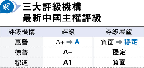 惠譽去年4月曾將中國主權評級展望由「穩定」調降至「負面」。事隔一年終下調評級,成三大評級機構中,給予中國主權評級最低者(第六高評級)。穆迪及標普目前分別給中國「A1」及「A+」評級(見表),同為第五高評級。穆迪於2023年12月降低中國評級展望從「穩定」至「負面」;惟標普仍維持對中國「穩定」的評級展望。