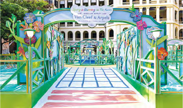 【明報專訊】趁春天來臨,Van Cleef & Arpels早前與緊密合作的創作伙伴、法國藝術家Alexandre Benjamin Navet攜手,將中環大館檢閱廣場搖身一變化身為滿載喜悅的春日遊樂場。自1906 年創立以來,植物和大自然一直是品牌的重要靈感來源。Navet參考大量品牌存檔圖像,創作出詩意的花卉拱門、韆鞦、涼亭和噴泉。
