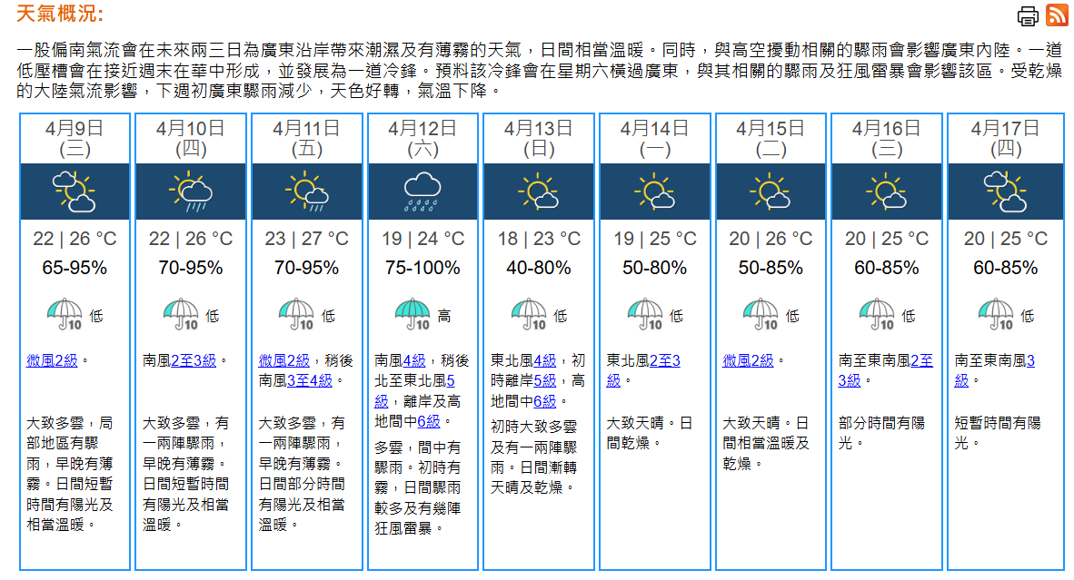 即時熱點 天氣|天文台:周三局部地區有驟雨 最高氣溫26°C (22:09) 發佈於 6 個月 前 2025 年 4 月 8 日 By 明報 天文台表示,本港周三(9日)局部地區有驟雨,早晚有薄霧,早上最低氣溫約22°C,日間短暫時間有陽光及相當溫暖,最高氣溫約26°C。吹微風。隨後一兩日潮濕及有薄霧,日間相當溫暖。周五(11日)部分時間有陽光。周六(12日)初時有霧,日間有驟雨及狂風雷暴,稍後北風增強。隨後一兩日氣溫下降,天色好轉,日間乾燥。 相關文章:天文台天氣天氣速遞 Up Next 關稅戰新消息(4月9日) (15:37) 不要錯過 美民眾囤積日用品、提早買家電 「發生關稅戰鬧劇,最好趁加價前買了」 (15:21) 繼續閱讀 贊助商 猜你喜歡 天氣|酷熱警告生效 天文台:周末有一兩陣驟雨 (08:22) 天氣|天文台:周四天晴局部地區有驟雨 最高32°C (20:56) 今年10月已有4日達33℃以上 破1884年以來紀錄 (17:45) 天氣|天文台:天晴酷熱最高33°C 局部地區有驟雨 (08:14) 天氣|天文台:周三天晴酷熱 最高33°C (21:00) 水利部和中國氣象局發布山洪預警 (22:56)