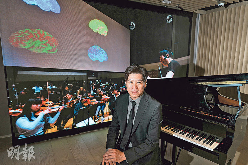 【明報專訊】浸會大學交響樂團本月初舉行周年音樂會,尾段演奏馬勒《D大調第一交響樂曲》時,擔任樂團指揮的浸大協理副校長(跨學科研究)潘明倫與其中3名樂手戴上頭套裝置,台上屏幕展示4人的腦電波影像。潘說戴頭套不美觀,但欲以行動親身向公眾及學生展示藝術科技的跨界別合作,「不論是我的學生,還是做學問的、做藝術的,他一定要勇氣跨出這一步」。