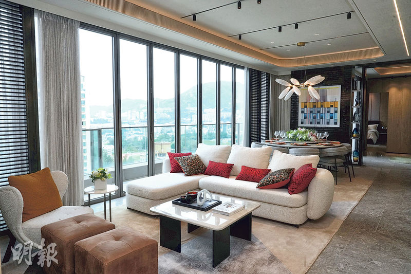 單位採用橫廳設計,特長客飯廳長逾9米,闊逾4.6米,擺放大地色系梳化及8人圓形餐桌,空間感十足;大廳外連私家平台,以摺疊式趟門與落地木製格柵分隔,延展空間並引景入室,並可俯瞰九龍塘低密度住宅,及遠眺中環維港上空景色。