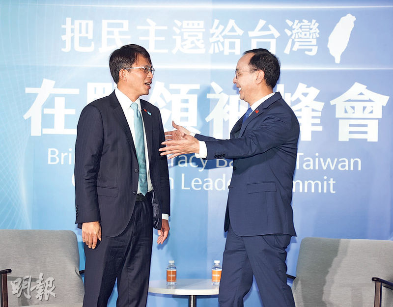 【明報專訊】國民黨與民眾黨昨上午共同舉辦「把民主還給台灣:在野領袖峰會」。國民黨主席朱立倫提出因應關稅戰,包括支持提高新台幣880億(約210億港元)特別條例金額等4大方向;台灣民眾黨主席黃國昌表示,應要求台灣與美國簽自由貿易協定(FTA),在野要做執政黨堅強後盾,向美國發出聲音。黃又表示不認同國民黨「倒閣」建議。