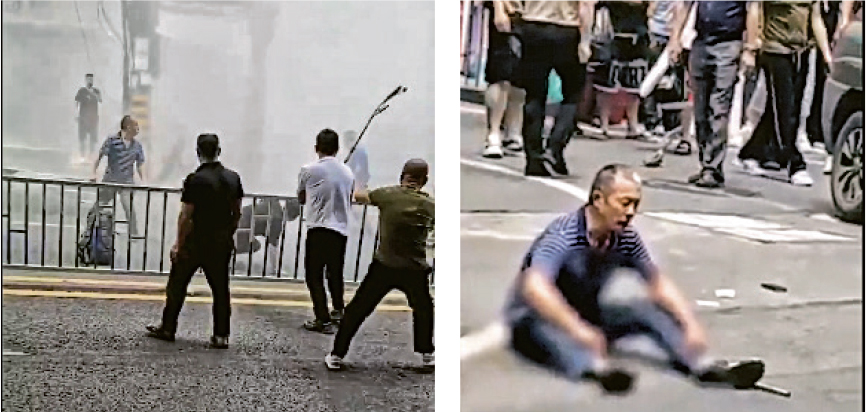 另一短片顯示,一男子捂住流血左胸,坐地待援。李男亦坐在不遠處地面,突從褲袋掏出折疊刀,多次刺、割自己頸部,任由鮮血冒出。警方到場後將李男壓制在地,反手鎖起後送院。目前未知疑兇犯案動機。渝中區是重慶中心城區,地處長江、嘉陵江匯流處,是重慶市委駐地,也是重慶地標朝天門所在地。