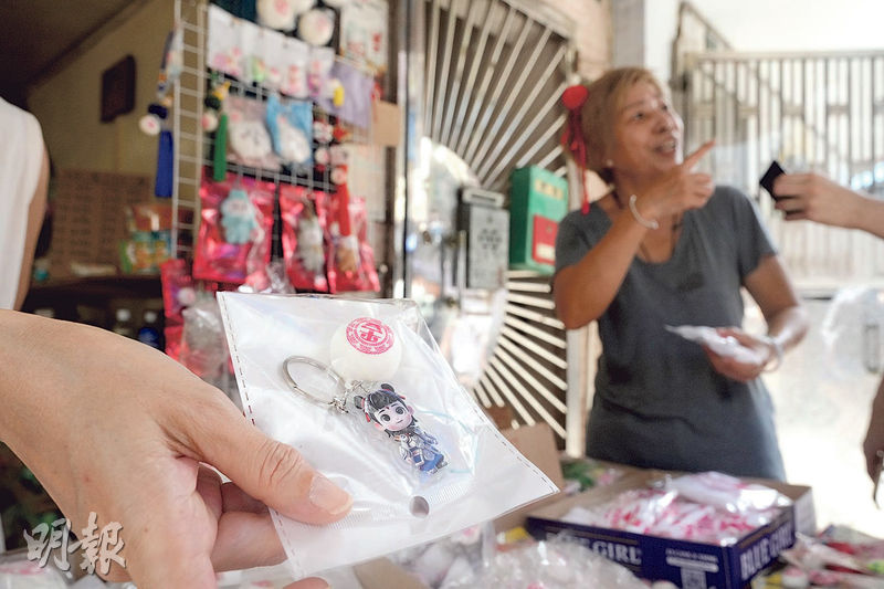 特色應節商品店前堆滿顧客,在長洲長大的張女士20多年來於太平清醮期間均開設快閃店,售賣平安包造型鎖匙扣。店舖約兩月前開始籌備,營業至太平清醮結束,她透露今年備貨約三四千個,其中「哪吒」款式入貨約百個,記者到訪時已賣剩最後一個,「無諗過咁搶手」;人氣公仔Labubu造型的款式亦幾近售清。鎖匙扣每個售10多元至約48元。