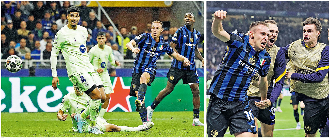 國際米蘭首回合作客被巴塞隆拿逼和3:3,此役憑及時傷癒復出的箭頭拿達路馬天尼斯於21分鐘先開紀錄。42分鐘,拿達路禁區內被敵衛古巴斯掃跌,球證經視像裁判(VAR)覆核後判12碼,國米由中場查漢奴古操刀得手以兩球領前半場。巴塞左閘謝拉特馬田換邊後54和60分鐘,分別助攻後衛艾利加西亞及中場丹尼爾奧莫扳平,更於87分鐘由翼鋒拉芬夏比洛尼射入今季第13個歐聯入球反超前3:2,不過其前線拍檔拉明耶馬在補時3分鐘射門中柱彈出僅42秒後,國米中堅法蘭斯高阿沙比接應杜費斯傳中射成3:3,結束90分鐘法定時間。及至加時上半場9分鐘,後備上陣的國米中場大衛法迪斯於禁區內射入奠勝球,最終以4:3險勝巴塞,總比數贏7:6,平了歐聯4強兩回合最多入球紀錄下,歷來第7次坐亞望冠。