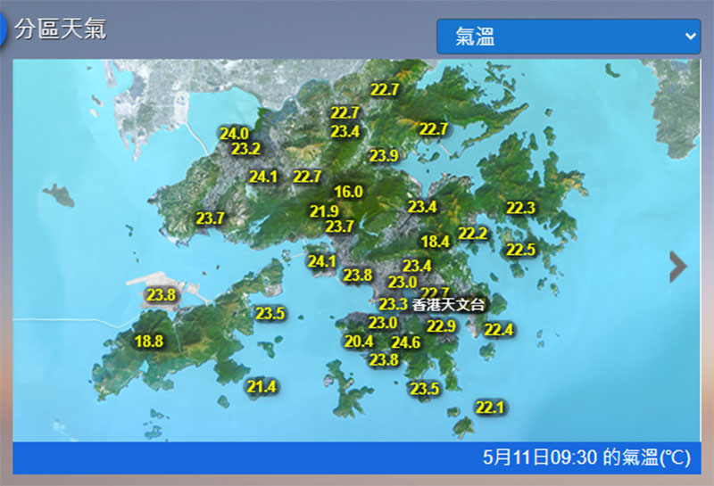 【09:30】天文台今日(11日)上午9時30分錄得氣溫23.3°C,相對濕度57%。一股清勁至強風程度東北季候風正為廣東沿岸帶來稍涼天氣。本港方面,今早氣溫普遍較昨日低三至五度,多處地區錄得約5毫米雨量。本港地區今日天氣預測:早上天氣稍涼及有一兩陣雨。日間部分時間天色明朗及乾燥,最高氣溫約26°C。吹和緩至清勁東北風,初時離岸及高地間中吹強風。展望明日(12日)天色好轉,日間乾燥。隨後一兩日部分時間有陽光及炎熱,亦有幾陣驟雨。(天文台)