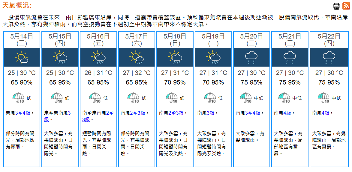 即時熱點 天氣|天文台:周三局部地區驟雨 最高30°C (20:56) 發佈於 5 個月 前 2025 年 5 月 13 日 By 明報 天文台表示,明日(14日)局部地區有驟雨,早上最低氣溫約25°C,日間部分時間有陽光及炎熱,最高氣溫約30°C。吹和緩偏東風。展望隨後數日短暫時間有陽光及炎熱,亦有幾陣驟雨。 相關文章:天文台天氣天氣速遞 Up Next 短片:北京降冰雹 車蓋砸出坑 (13:42) 不要錯過 關稅戰|中美大幅暫緩關稅 一文睇中美關稅變化時序 (18:22) 繼續閱讀 贊助商 猜你喜歡 天文台發出一號戒備信號 (15:40) 三號波|天文台料本港風力下午減弱 當普遍地區不再受強風威脅 會考慮改發一號戒備信號 (09:50) 三號波|天文台:本港風力開始減弱 當普遍地區不再受強風威脅 會考慮改發一號戒備信號 (13:50) 中秋節天氣預告:驟雨減少 部分時間有陽光 (20:01) 所有熱帶氣旋警告信號取消 (22:25) 麥德姆 | 廣東轉移逾15萬人 7市啟動應急響應 (00:59)