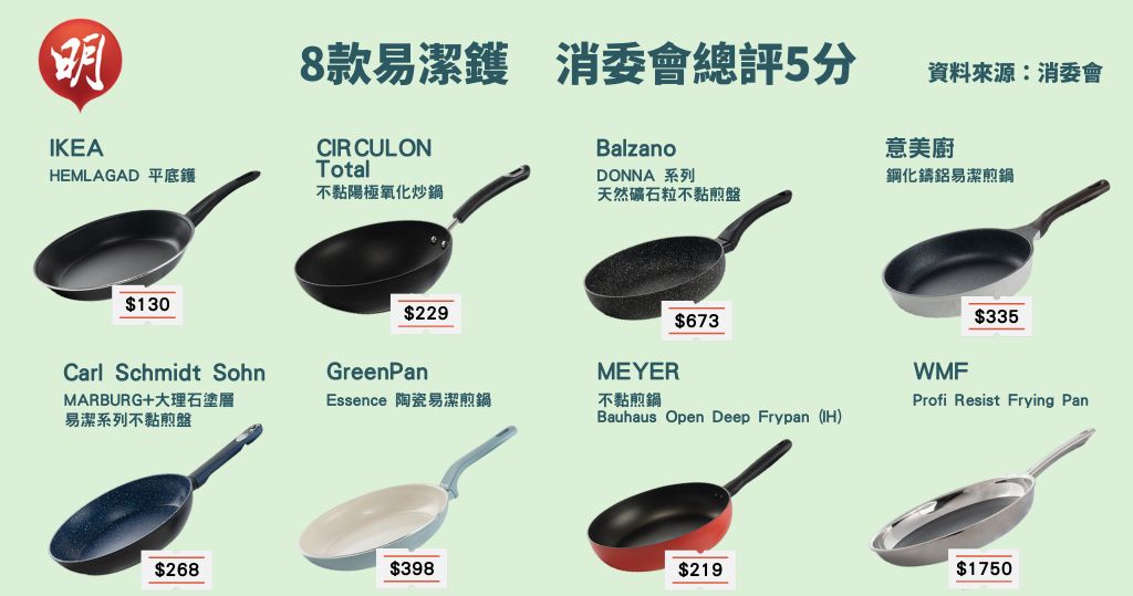 獲消委會總評5分的8款易潔鑊(品牌/名稱/直徑/售價/聲稱原產地)