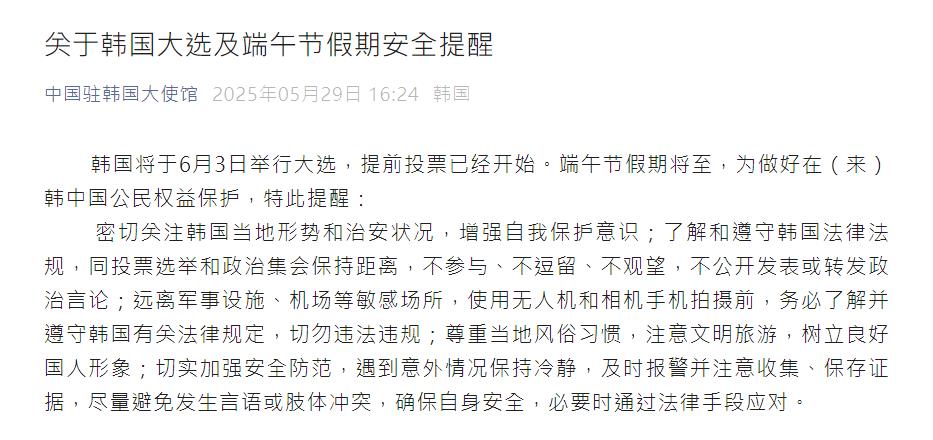 中國駐韓大使館微信公眾號29日發布「關於韓國大選及端午節假期安全提醒」,呼籲在韓公民密切關注韓國當地形勢和治安狀況,增強自我保護意識;了解和遵守韓國法律法規,與投票選舉和政治集會保持距離,不參與、不逗留、不觀望,不公開發表或轉發政治言論。