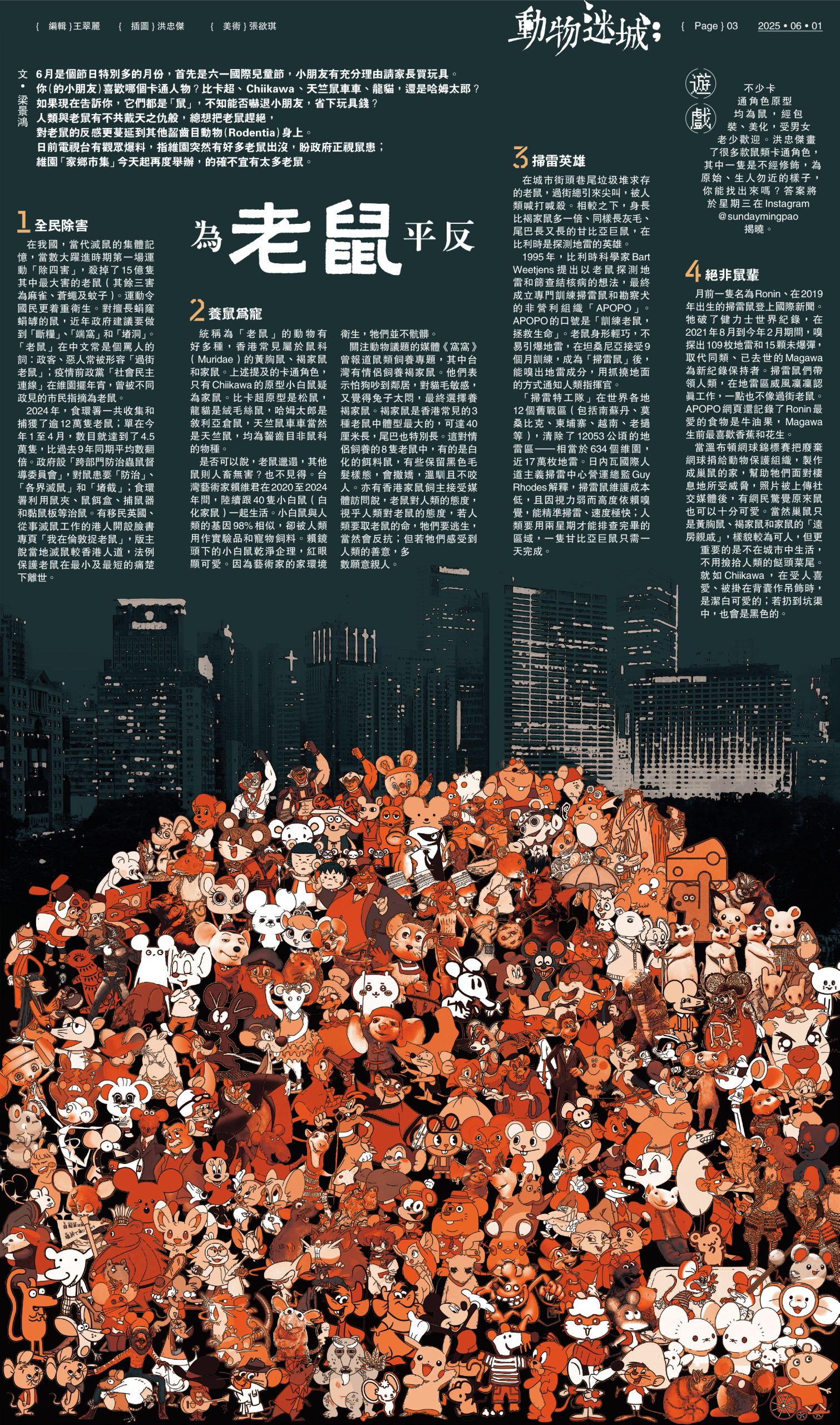 不少卡通角色原型均為鼠,經包裝、美化,受男女老少歡迎。洪忠傑畫了很多款鼠類卡通角色,其中一隻是不經修飾,為原始、生人勿近的樣子,你能找出來嗎?答案將於星期三在Instagram @sundaymingpao揭曉。