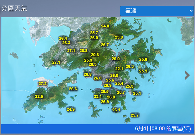 即時熱點 天氣|天文台:有幾陣驟雨 最高氣溫29°C (08:16) 發佈於 4 個月 前 2025 年 6 月 4 日 By 明報 上午8時,天文台錄得氣溫26.9°C,相對濕度84%。 一股偏東氣流正影響廣東沿岸。本港方面,今早(4日)各區氣溫較昨日低一兩度。此外,與高空擾動相關的驟雨及雷暴正影響南海北部。本港地區今日天氣預測大致多雲,有幾陣驟雨。日間最高氣溫約29°C。吹和緩東至東北風,稍後離岸風勢清勁。 展望明日(5日)仍有幾陣驟雨,早上稍涼。隨後兩三日部分時間有陽光。下周初日間酷熱。(天文台) 相關文章:天文台天氣天氣速遞 Up Next 郭子豪外遊疑被牀蝨咬 一文看牀蝨特性、被咬處理、防蝨貼士 (14:52) 不要錯過 短片:綠色和平偷馬克龍蠟像「示眾」 抗議法俄持續貿易 (17:17) 繼續閱讀 贊助商 猜你喜歡 天氣|酷熱警告生效 天文台:周末有一兩陣驟雨 (08:22) 天氣|天文台:周四天晴局部地區有驟雨 最高32°C (20:56) 今年10月已有4日達33℃以上 破1884年以來紀錄 (17:45) 天氣|天文台:天晴酷熱最高33°C 局部地區有驟雨 (08:14) 天氣|天文台:周三天晴酷熱 最高33°C (21:00) 水利部和中國氣象局發布山洪預警 (22:56)