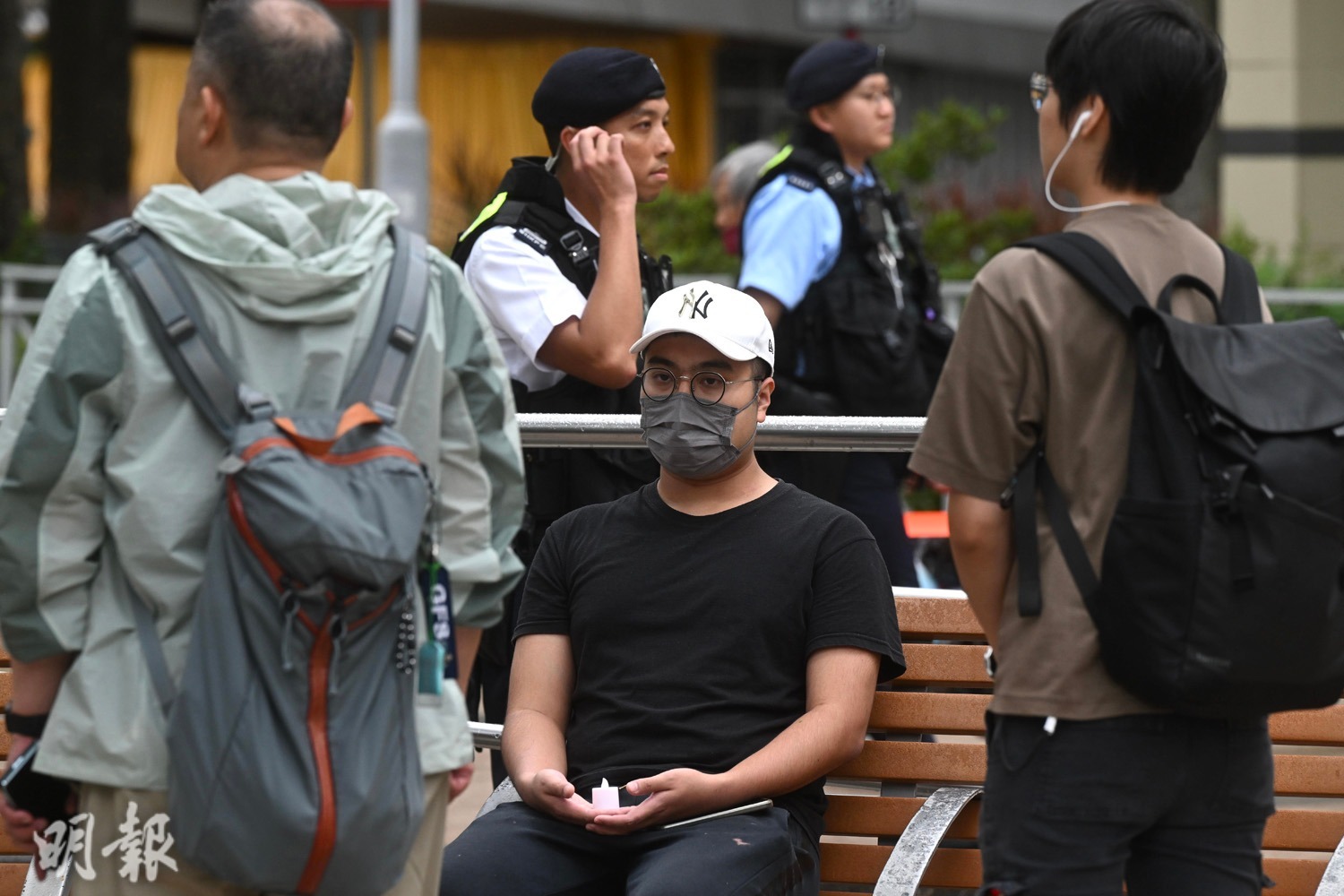 一名穿白色襯衫灰色西褲男子,坐在維園外圍的長椅,其後被警員截查,他其後被帶上警車。據悉警方在其背包搜出三個電子蠟燭。