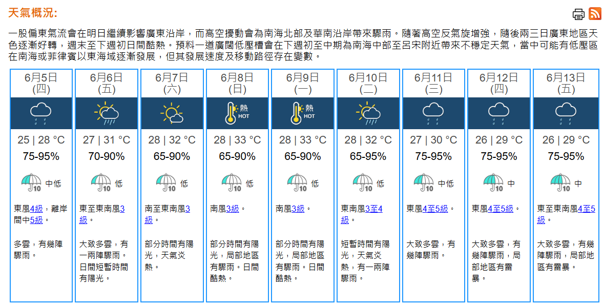 即時熱點 天氣|天文台:周四有驟雨 氣溫介乎25至28°C (20:57) 發佈於 4 個月 前 2025 年 6 月 4 日 By 明報 天文台表示,周四(5日)有幾陣驟雨,氣溫介乎25至28°C,吹和緩偏東風,離岸風勢間中清勁。展望周五(6日)仍有一兩陣驟雨。隨後兩三日部分時間有陽光,下周初日間酷熱。 相關文章:天文台天氣天氣速遞 Up Next 郭子豪外遊疑被牀蝨咬 一文看牀蝨特性、被咬處理、防蝨貼士 (14:52) 不要錯過 短片:綠色和平偷馬克龍蠟像「示眾」 抗議法俄持續貿易 (17:17) 繼續閱讀 贊助商 猜你喜歡 天氣|酷熱警告生效 天文台:周末有一兩陣驟雨 (08:22) 天氣|天文台:周四天晴局部地區有驟雨 最高32°C (20:56) 今年10月已有4日達33℃以上 破1884年以來紀錄 (17:45) 天氣|天文台:天晴酷熱最高33°C 局部地區有驟雨 (08:14) 天氣|天文台:周三天晴酷熱 最高33°C (21:00) 水利部和中國氣象局發布山洪預警 (22:56)