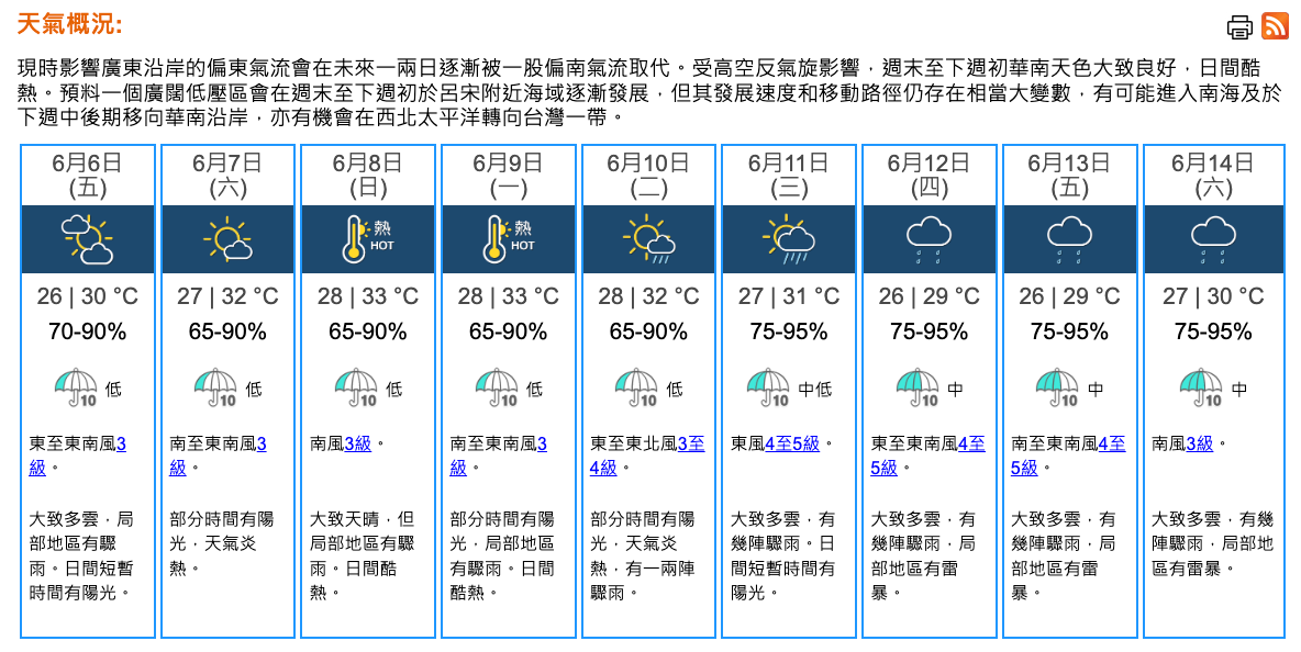 即時熱點 天氣|天文台:周五多雲局部地區有驟雨 最高30°C (20:58) 發佈於 4 個月 前 2025 年 6 月 5 日 By 明報 天文台表示,本港地區明日(6日)大致多雲,局部地區有驟雨。明早最低氣溫約26°C,日間短暫時間有陽光,市區最高氣溫約30°C,新界再高一兩度。吹和緩東至東南風。展望隨後兩三日部分時間有陽光,下周初日間酷熱。(天文台) 相關文章:天文台天氣天氣速遞編輯推介 Up Next 馬斯克特朗普撕破臉 隔空罵戰時序一文睇 (15:30) 不要錯過 李在明當選韓國總統 短片回顧李在明曾被刺頸、涉違公職判監上訴得直 (00:40) 繼續閱讀 贊助商 猜你喜歡 天氣|酷熱警告生效 天文台:周末有一兩陣驟雨 (08:22) 天氣|天文台:周四天晴局部地區有驟雨 最高32°C (20:56) 今年10月已有4日達33℃以上 破1884年以來紀錄 (17:45) 天氣|天文台:天晴酷熱最高33°C 局部地區有驟雨 (08:14) 天氣|天文台:周三天晴酷熱 最高33°C (21:00) 水利部和中國氣象局發布山洪預警 (22:56)