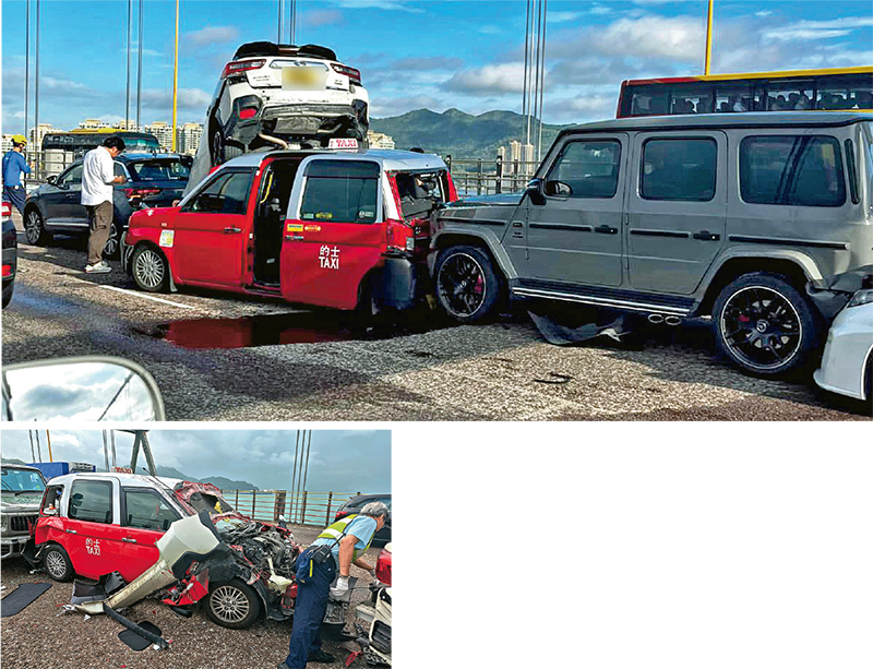 【明報專訊】青馬大橋昨晨7時許發生5車「串燒」相撞,涉及4輛私家車及一輛的士。事發時5輛車沿快線往機場方向行駛,駛至橋面中間位置,因應交通情况,前行私家車收慢,尾隨「掃把佬」亦相應煞停,但後至的士、平治四驅車及七人車收掣不及撞前。「掃把佬」被的士撞至車尾剷起,車底擱在的士車頭(上圖)。警方及救援人員接報到場,「掃把佬」26歲盧姓男司機腳部受傷、的士44歲呂姓男司機手及頸受傷、七人車48歲梁姓男司機腹部受傷,各人被送瑪嘉烈醫院治理。下圖為「串燒」車龍中間之的士,車頭嚴重損毁。