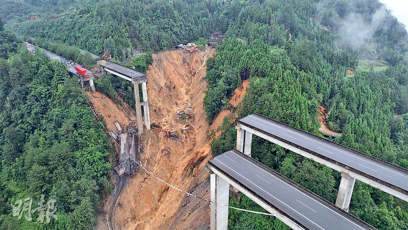 【明報專訊】廈蓉高速(廈門至成都)貴州省三都縣境內猴子河特大橋引橋昨日因山泥傾瀉垮塌,一輛大貨車車頭駛出斷橋面,懸在十幾米高空中,司機之後經救援雲梯爬回地面。片段在網上流傳,網民紛讚該司機「福大命大」,而司機表示自己「下來之後腳都站不穩了」。