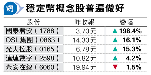 穩定幣概念股瘋炒 國泰君安國際飈兩倍成交164億