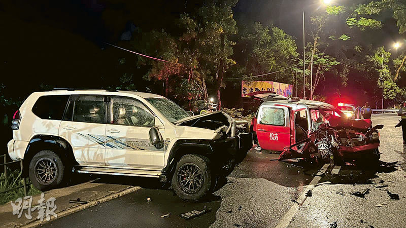【明報專訊】粉錦公路昨凌晨發生致命車禍。一輛的士懷疑失控越線,與一輛四驅車迎頭相撞,的士司機與兩名男乘客被困,其中一名41歲男乘客被救出時昏迷,送院後不治。的士司機與另一男乘客及四驅車司機同受傷,清醒送院。警方正調查意外原因,案件交由新界北總區交通部特別調查隊跟進調查。