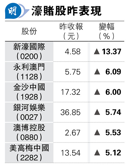 金融股為升市主力,建設銀行(0939)、工商銀行(1398)、中國銀行(3988)及招商銀行(3968)為大市貢獻逾70點升幅;科技股個別發展,美團(3690)、京東(9618)、小米(1810)靠穩,騰訊、阿里偏軟;澳門6月博彩收入好過市場預期,銀娛(0027)、美高梅(2282)升超過半成,金沙(1928)、永利澳門(1128)升6%(見表)。