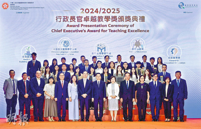 【明報專訊】行政長官卓越教學獎噚日喺政府總部舉行頒獎典禮,今屆共有29名教師獲獎,當中12人獲卓越教學獎,12人獲嘉許狀,而今年新增嘅「新秀教師獎」同「創新教育獎」就分別有兩人同3人獲獎。有價值觀教育獎得獎教師話,學校以中華文化為主幹,將國民、國安教育加入唔同科目。
