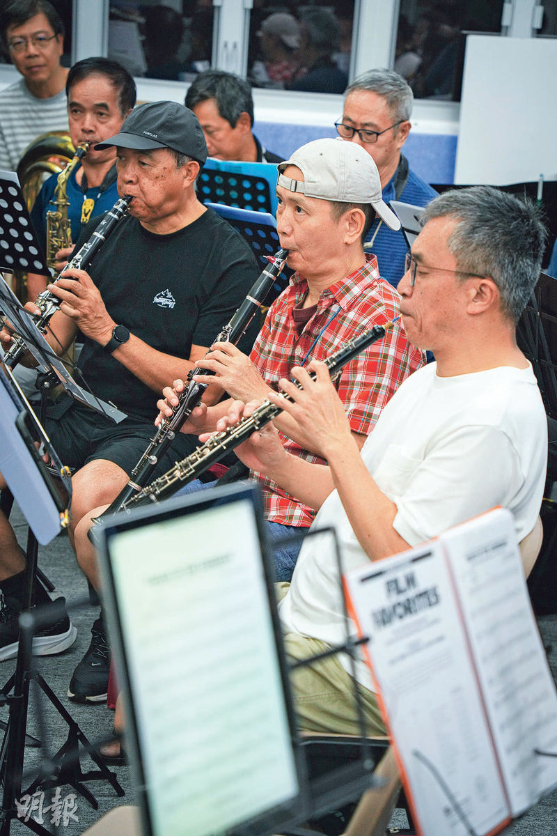 【明報專訊】他滿頭大汗,手提小號箱。仔細留意會發現,皮箱上有薄薄灰塵——出門前大概已稍稍抹拭過。每逢周二傍晚7點,葵涌貨櫃碼頭附近工廈單位,有一班沒有著老西、非值青春年華的樂手,「嗚嗚嗚」地吹奏着。穿著夏威夷風紅色恤衫的叔叔,7月初首次到樂室上課,成為「五十男樂團」初團一員。現場色彩談不上繽紛,倒是親切的冷色系雜燴:穿Polo恤、T恤和足球衫的,顏色總是黑、藍、灰和白。這個他是別人的爸爸,那個他是一家之主,還有很多個他放下樂器數十年,重新吹一吹,又在手心寫筆記,躍躍欲試。