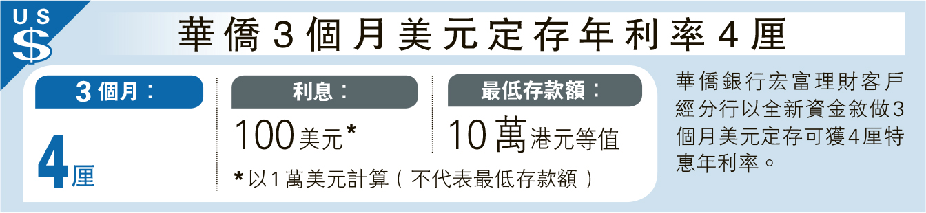 經濟 華僑3個月美元定存年利率4厘 發佈於 2 個月 前 2025 年 8 月 5 日 By 明報 【明報專訊】華僑銀行宏富理財客戶經分行以全新資金敘做3個月美元定存可獲4厘特惠年利率。 日報新聞-相關報道: 南商7日港元定存年利率6.8厘 (2025-08-05) 相關文章:南商7日港元定存年利率6.8厘 (2025-08-05) Up Next 險企投資職能遷星洲 港勸喻回流 保監局:沒法定要求 惟須確保迅速理賠 不要錯過 南向理財通買基金債券增至佔41% 金管局:上月再優化措施後 比例料續升 繼續閱讀 贊助商 猜你喜歡