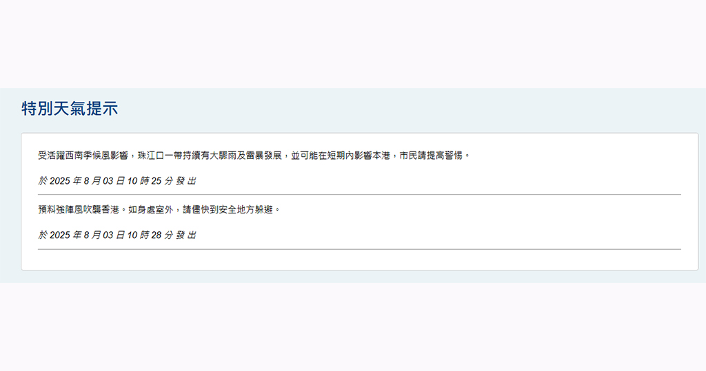 即時港聞 天文台:珠江口一帶持續大驟雨雷暴發展 強陣風料襲港 (10:32) 發佈於 2 個月 前 2025 年 8 月 3 日 By 明報 天文台早上10時25分表示,受活躍西南季候風影響,珠江口一帶持續有大驟雨及雷暴發展,並可能在短期內影響本港。亦預料強陣風吹襲香港。如身處室外,請盡快到安全地方躲避。 相關文章:天文台天氣編輯推介 Up Next 天文台改發黑色暴雨警告 (23:46) 不要錯過 本港首宗基孔肯雅熱輸入個案 12歲患病男童潛伏期在佛山 (18:54) 繼續閱讀 贊助商 猜你喜歡 天氣|天文台:大致多雲 最高氣溫32°C (08:13) 天文台發出一號戒備信號 (15:40) 三號波|天文台料本港風力下午減弱 當普遍地區不再受強風威脅 會考慮改發一號戒備信號 (09:50) 三號波|天文台:本港風力開始減弱 當普遍地區不再受強風威脅 會考慮改發一號戒備信號 (13:50) 中秋節天氣預告:驟雨減少 部分時間有陽光 (20:01) 所有熱帶氣旋警告信號取消 (22:25)