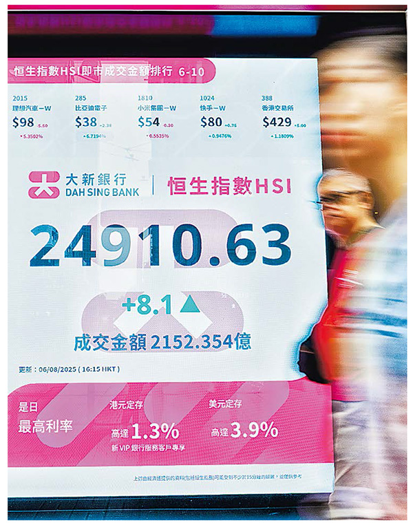 港股方面,恒指低開38點,最多跌96點,低見24,806點,其後A股做好,港股臨近中午一度最多升100點,見25,002點,但之後升幅收窄,收市升8點,報24,910點。恒指三連升,累漲402點。國指昨跌0.21%,報8932點;科指升0.2%,報5532點。大市成交連續4日縮減,昨減至2152億元。北水淨流入減59%至94.85億元。