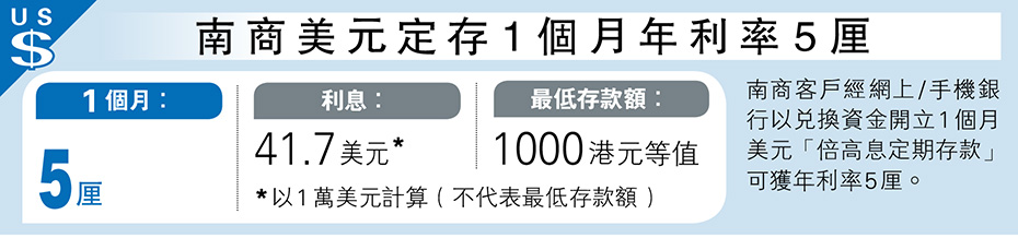 經濟 南商美元定存1個月年利率5厘 發佈於 2 個月 前 2025 年 8 月 12 日 By 明報 【明報專訊】南商客戶經網上/手機銀行以兌換資金開立1個月美元「倍高息定期存款」可獲年利率5厘。(圖) 日報新聞-相關報道: 建行亞洲港元定存3個月年利率6.88厘 (2025-08-12) 相關文章:建行亞洲港元定存3個月年利率6.88厘 (2025-08-12) Up Next 遠展周企增持布里斯本賭場權益至一半 不要錯過 法籍CEO港工作30年 早與大酒店有接觸 繼續閱讀 贊助商 猜你喜歡