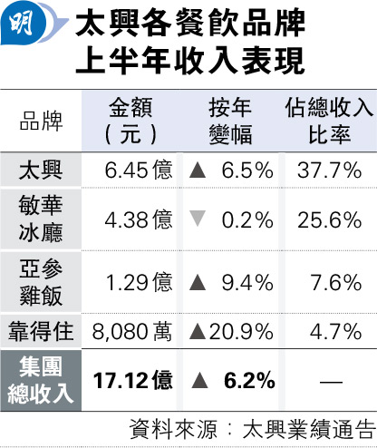 按太興各個餐飲品牌收入分類計,佔期內總收入近38%的旗艦品牌「太興」,收入按年升7%至6.5億元(見表)。「敏華冰廳」收入按年略跌0.2%至4.4億元,佔總收入比例按年跌1.6個百分點至25.6%。太興稱去年下半年至今年上半年間,整合「敏華冰廳」店舖,並關閉部分表現未如理想的分店。「亞參雞飯」收入按年升9%,集團表示期內新增兩間分店,令總店舖數目增至21間。提供粥、麵及糉等傳統中菜的「靠得住」,收入按年升21%表現最亮麗。