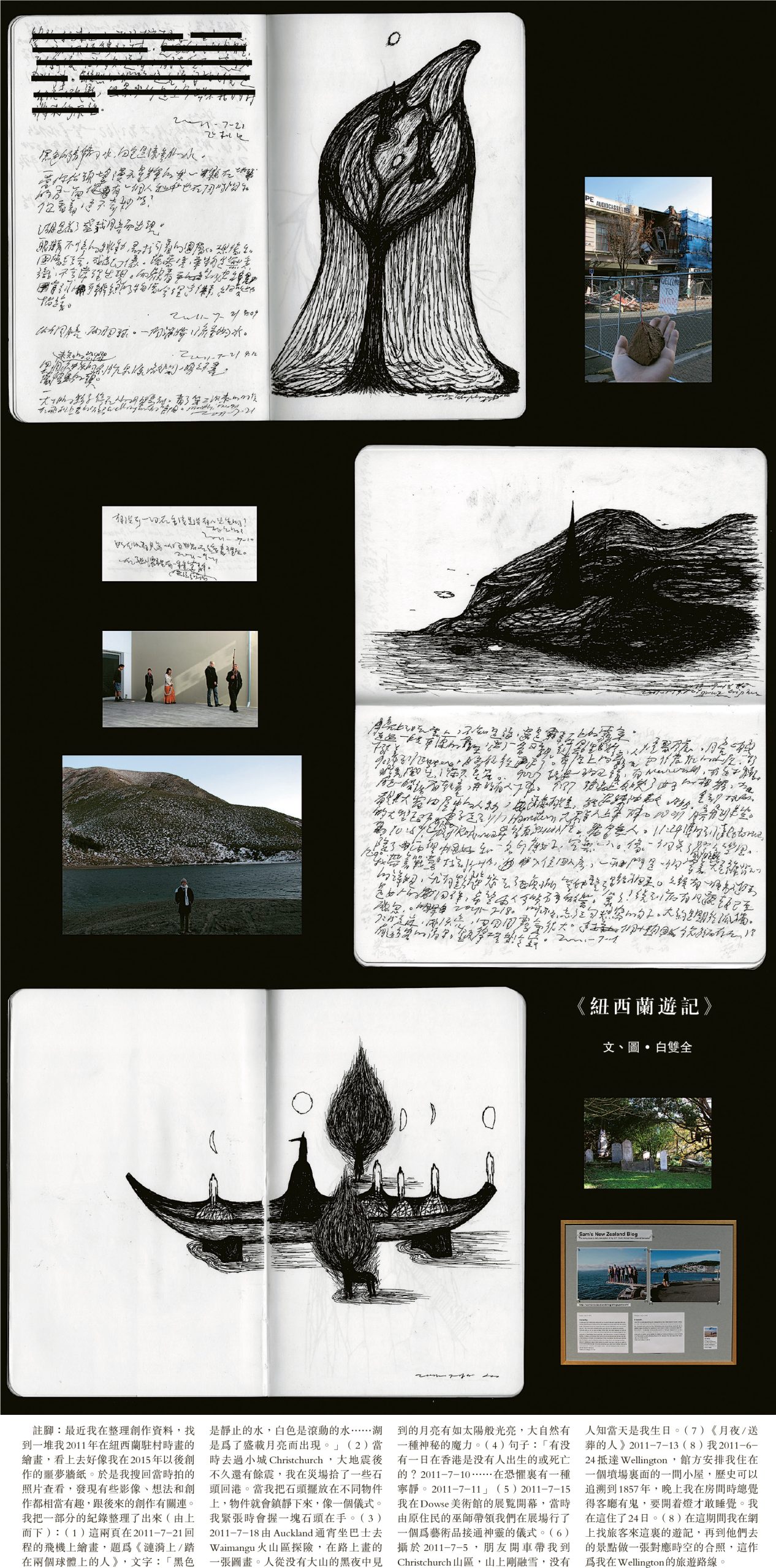 【明報專訊】註腳:最近我在整理創作資料,找到一堆我2011年在紐西蘭駐村時畫的繪畫,看上去好像我在2015年以後創作的噩夢牆紙。於是我搜回當時拍的照片查看,發現有些影像、想法和創作都相當有趣,跟後來的創作有關連。我把一部分的紀錄整理了出來(由上而下):(1)這兩頁在2011-7-21回程的飛機上繪畫,題為《漣漪上/踏在兩個球體上的人》,文字:「黑色是靜止的水,白色是滾動的水……湖是為了盛載月亮而出現。」(2)當時去過小城Christchurch,大地震後不久還有餘震,我在災場拾了一些石頭回港。當我把石頭擺放在不同物件上,物件就會鎮靜下來,像一個儀式。我緊張時會握一塊石頭在手。(3)2011-7-18由Auckland通宵坐巴士去Waimangu火山區探險,在路上畫的一張圖畫。人從沒有大山的黑夜中見到的月亮有如太陽般光亮,大自然有一種神秘的魔力。(4)句子:「有沒有一日在香港是沒有人出生的或死亡的?2011-7-10……在恐懼裏有一種寧靜。2011-7-11」(5)2011-7-15我在Dowse美術館的展覧開幕,當時由原住民的巫師帶領我們在展場行了一個為藝術品接通神靈的儀式。(6)攝於2011-7-5,朋友開車帶我到Christchurch山區,山上剛融雪,沒有人知當天是我生日。(7)《月夜/送葬的人》2011-7-13(8)我2011-6-24抵達Wellington,館方安排我住在一個墳場裏面的一間小屋,歷史可以追溯到1857年,晚上我在房間時總覺得客廳有鬼,要開着燈才敢睡覺。我在這住了24日。(8)在這期間我在網上找旅客來這裏的遊記,再到他們去的景點做一張對應時空的合照,這作為我在Wellington的旅遊路線。