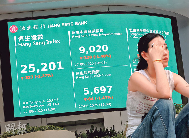 恒指高開101點,早段最多升129點,高見25,653點,A股午後走弱,恒指亦跟隨跌幅擴大,最多跌384點,低見25,140點,收市跌323點。恒指兩連跌,累瀉628點。國指跌1.4%,報9020點;科指跌1.47%,報5697點。
