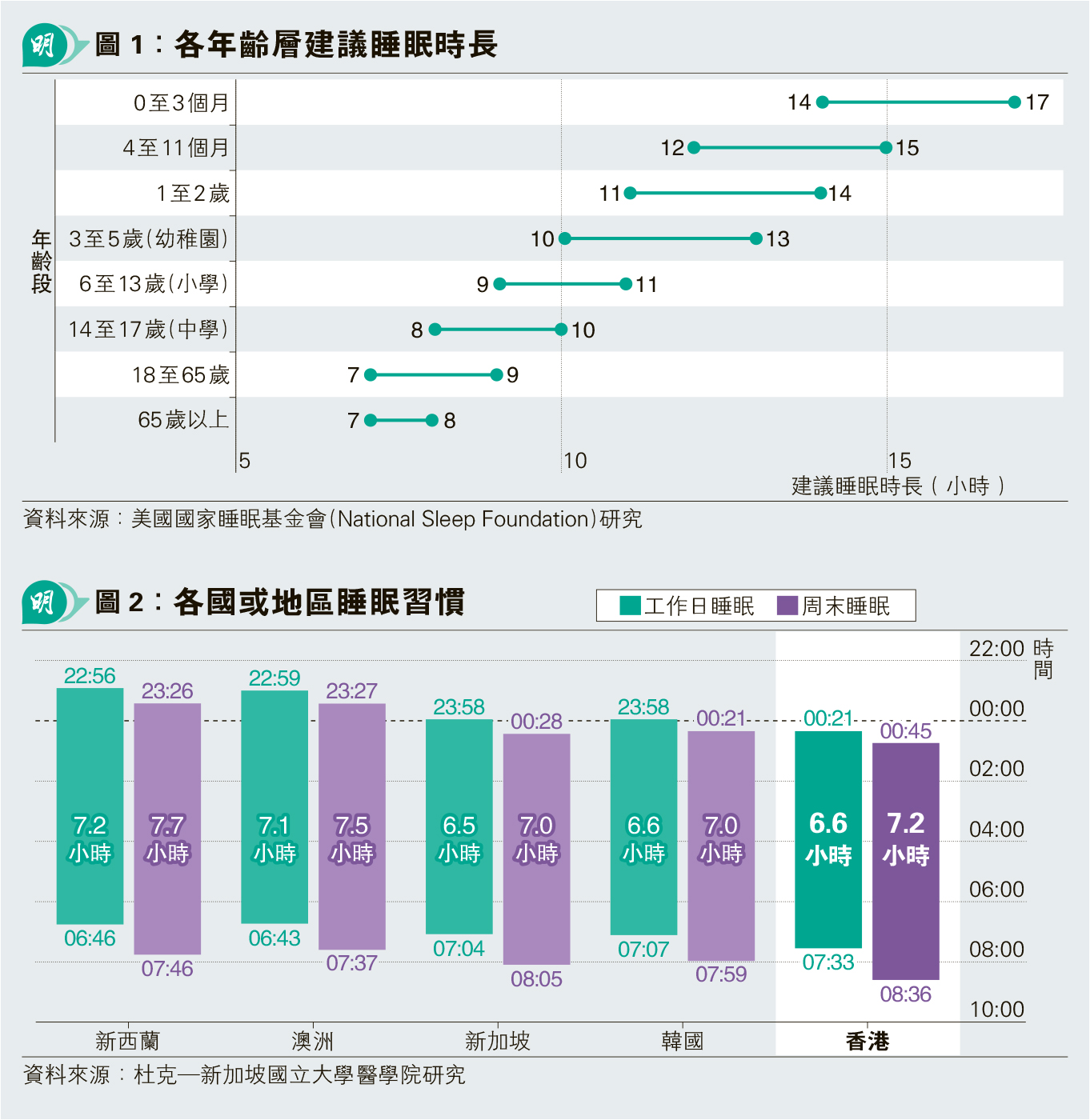 不過本港青少年睡眠不足率持續惡化,扭轉學童的睡眠習慣並非易事。團隊成員精神科學系教授陳秀雯指出,不少家長輕視睡眠健康,再受成績至上的教育觀念影響,導致學童需犧牲睡眠學習、溫書。她引用美國國家睡眠基金會 (National Sleep Foundation)建議稱,小學生應每天睡9至11小時,中學生則應每天睡8至10小時(見圖1),但達標港生只佔少數,「孩童想睡也睡不到,除了自身壓力,亦涉學校的結構性因素,包括課堂安排、功課數量等」。