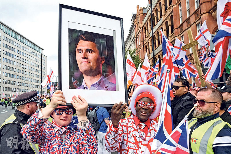 【明報專訊】英國倫敦市警方上周六(13日)估計有11萬至15萬人參加當天由化名羅賓遜(Tommy Robinson)、真名亞克斯利-倫農(Stephen Yaxley-Lennon)的極右名人發起的「團結國家」(Unite the Kingdom)反移民大遊行,遊行人數不僅遠超預計,且為當代英國其一最大規模的右翼示威。警方表示遊行過程中,示威者曾企圖更改遊行路線,並向阻撓的警員拳打腳踢或擲瓶子、照明彈等,導致26名警員受傷,當中4人傷勢嚴重。警方初步拘捕涉案25人,待確認到更多擾亂秩序者,可能會再作拘捕。部分遊行人士高舉日前在美國猶他州遭槍殺的美國右翼網紅柯克的照片,向他致敬。