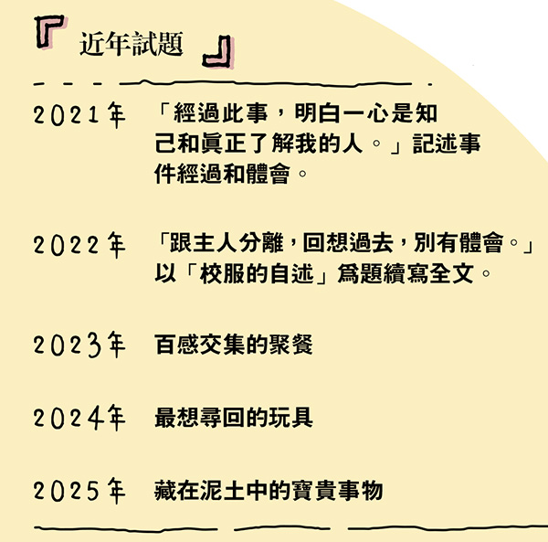 教育 搶救卷二:卷二命題寫作 題型分析 發佈於 1 個月 前 2025 年 9 月 16 日 By 明報 【明報專訊】命題寫作,扣題十分重要。題目文字模糊,或限制較多,甚至出現新的題型等,都會影響扣題表現。扣題不穩,引致選材不當,立意不明,分數當然大打折扣。試看看近年DSE的寫作題型和題目。 日報新聞-相關報道: 搶救卷二:敘寫抒趨隱晦 論說變革最劇烈 (2025-09-16) 相關文章:搶救卷二:敘寫抒趨隱晦 論說變革最劇烈 (2025-09-16)星笈中文 第170期 Up Next 創社區地圖計劃助自閉童 港大生膺十大傑出大專生 不要錯過 西貢幼園小學博覽 N班家長憂內地生競爭 繼續閱讀 贊助商 猜你喜歡 搶救卷二:敘寫抒趨隱晦 論說變革最劇烈 經典解讀:柳宗元「打筍工」之迷思與真相——從學生誤讀〈始得西山宴遊記〉談起 中文解剖師:錨定核心思路 循序昇華立意