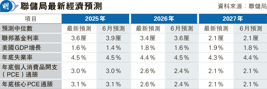 聯儲局本季公布的經濟預測,官員對利率預期中位數由3.9厘降至3.6厘,預示至今年底再減息的次數由1次增加至2次,即10月和12月皆會減息0.25厘,與利率期貨反映市場預期至年底再減0.5厘的看法相同。官員預期明年底利率中位數為3.4厘,即維持明年減息0.25厘的預期。不過成員看法更為分歧,預期至明年底再減息1.25厘至1.5厘的官員,今季由2名增至5名。