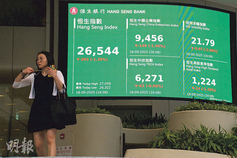 【明報專訊】美聯儲鷹派減息,美匯由隔晚低位反彈1%,恒指昨短暫試穿二萬七關,再創逾4年高位後受阻。A股午後跌勢轉急,港股回吐壓力增,最多倒跌近600點,收市跌363點,報26,544點,成交增至逾4133億元,為超過5個月以來最多,「ATXJ」同轉跌,兩地的金融及地產股齊現沽壓。