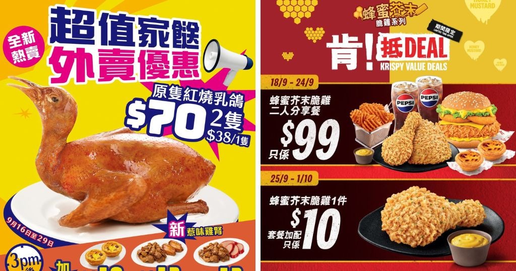 大家樂外賣乳鴿2隻$70 KFC蜂蜜芥末脆雞桶餐$99 大快活$12加購兩款港式小食|著數情報 (11:11)