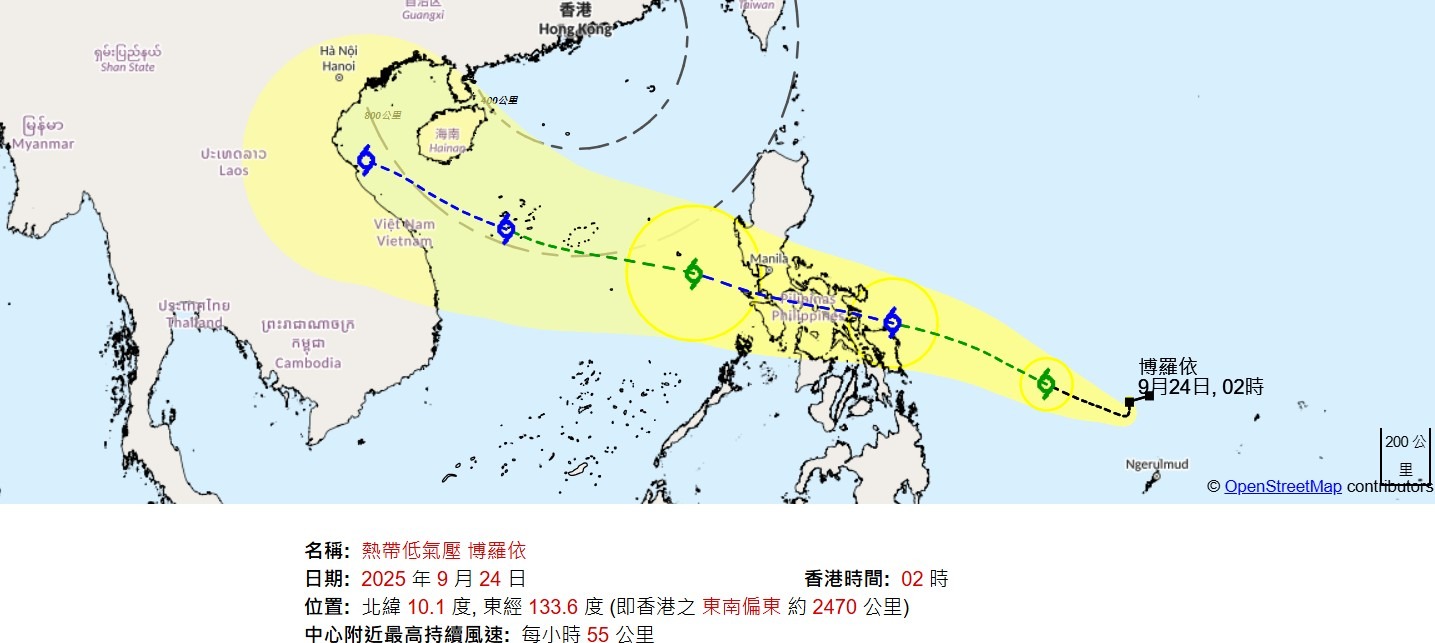 即時熱點 熱帶低氣壓博羅依生成 料靠近菲律賓東部沿海 (09:12) 發佈於 7 天 前 2025 年 9 月 24 日 By 明報 熱帶低氣壓博羅依生成。內地中央氣象台表示,屬今年「第20號颱風」的博羅依於今晨(24日)5時在菲律賓以東洋面生成,其中心位於菲律賓馬尼拉東偏南方向約1420公里的西北太平洋洋面上;預計博羅依將以每小時10至15公里的速度向偏西方向移動,逐漸向菲律賓東部沿海靠近,於27日進入南海東部海域,之後向西北方向移動,強度有所增強。 相關文章:博羅依天氣速遞熱帶低氣壓編輯推介 Up Next 短片:颱風過後港島東海濱多塌樹 無阻市民運動 (14:14) 不要錯過 短片:三號風球杏花邨大浪 市民圍觀 (15:09) 繼續閱讀 贊助商 猜你喜歡 天氣|天文台:天晴酷熱 周末期間風勢頗大有驟雨 (08:21) 天氣|天文台:早上局部地區有驟雨 最高氣溫32°C (08:17) 天氣|天文台:周二天晴酷熱 最高氣溫33°C (20:57) 博羅依越南登陸 至少11死20人失蹤 (15:10) 天氣|天文台:今日多雲有驟雨 市區最高氣溫31°C (09:10) 天氣|天文台:周一早上局部地區有驟雨 日間炎熱 (20:37)
