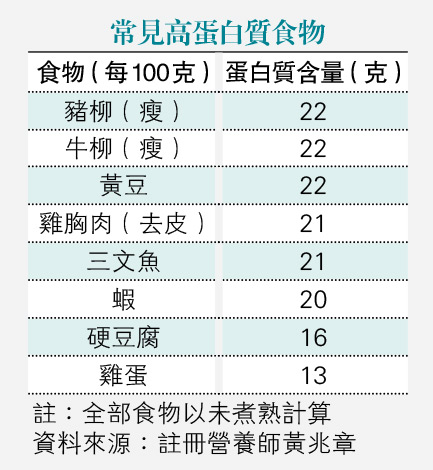 【明報專訊】蛋白質是建構身體細胞和組織一個基礎要素。註冊營養師陸肇麟指出,「從肌肉、內臟、皮膚到頭髮等,都由蛋白質構成;當身體受傷時,需要更多蛋白質來修復傷口」。此外,一些免疫細胞、抗體、激素等亦需要蛋白質構成,它們負責調節新陳代謝、免疫反應過程。而蛋白質中的膠原蛋白也是骨骼重要組成部分,有助維持骨骼強度。