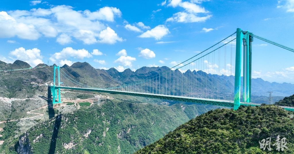貴州花江峽谷大橋全長2890米,跨越被譽為「地球裂縫」的花江大峽谷,將兩岸通行時間從兩個多小時縮短到兩分鐘左右;橋面距水面625米,相當於美國金門大橋的約9倍,高度居世界第一。主橋跨徑1420米,為山區橋樑跨徑世界第一。(新華社/人民日報)