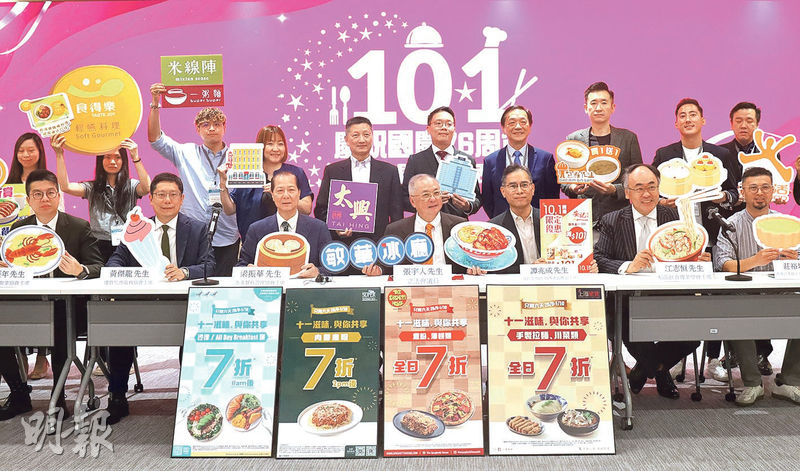 【明報專訊】明天是十一國慶日,飲食界再推優惠,自由黨立法會議員張宇人昨聯同飲食界多個團體公布詳情,今年逾3000間食肆及商戶提供菜式及餐飲優惠。張宇人稱,今年優惠期不限於國慶當日,部分食肆將優惠提前或延長至國慶前後,冀藉活動吸引港人留港消費,「國慶期間不出門光顧這些食肆,是市民的損失」,呼籲內地及外國旅客來港體驗特別優惠。