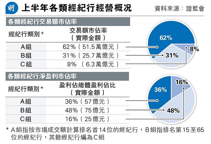 聯交所經紀參與者上半年淨盈利156億元,較此前個月增34%。按參與者市佔率分類計,市場成交額排名首14位的A組經紀行,其總成交額市佔率(下稱成交市佔率)達62%,但按其淨盈利計算、其與整體經紀行盈利的佔比為36%(見圖),盈利佔比較交易市佔率相差逾半。市場成交額排名第15至65位至於市場成交額排名第15至65位、總成交額市佔率為31%的B組經紀行,其淨盈利市佔率達48%;屬C組的其餘經紀行,期內成交市佔率為8%,淨盈利較下半年升逾1倍至25億元,淨盈利佔比於同期升5.46個百分點至16%。