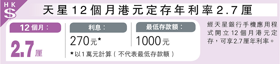 經濟 天星12個月港元定存年利率2.7厘 發佈於 1 週 前 2025 年 9 月 30 日 By 明報 【明報專訊】經天星銀行手機應用程式開立12個月港元定存,可享2.7厘年利率。(圖) 日報新聞-相關報道: 南商3個月美元定存年利率4厘 (2025-09-30) 相關文章:南商3個月美元定存年利率4厘 (2025-09-30) Up Next 港交所建議衍生權證最低價降至0.15元 不要錯過 有中小發展商受壓 銀行放貸轉趨審慎 繼續閱讀 贊助商 猜你喜歡