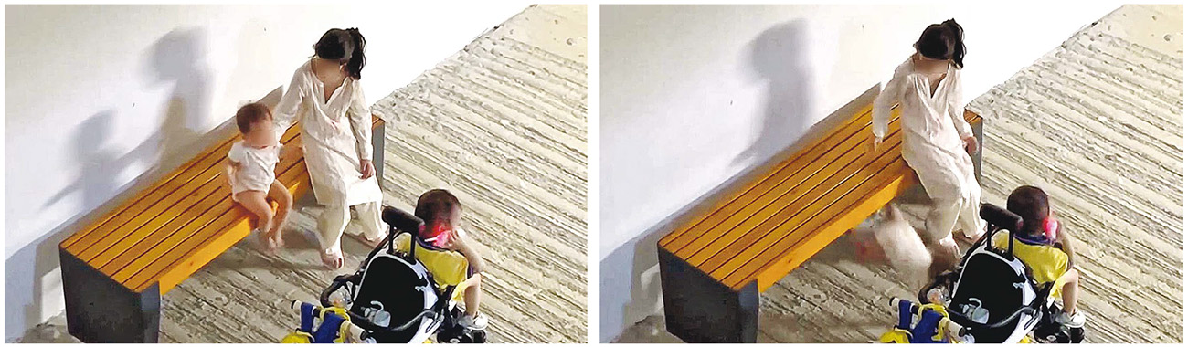 網上流傳兩段從高處拍攝的影片顯示,涉事女童先將女嬰從長櫈推落地上,再抱起女嬰上下晃動並放回長櫈,未幾第二次推跌女嬰在地;另一片段則拍攝到女童將女嬰打橫抱起,並左右搖晃。兩片長逾1分鐘,女嬰全程哭喊,男童則坐在嬰兒車目睹事件。