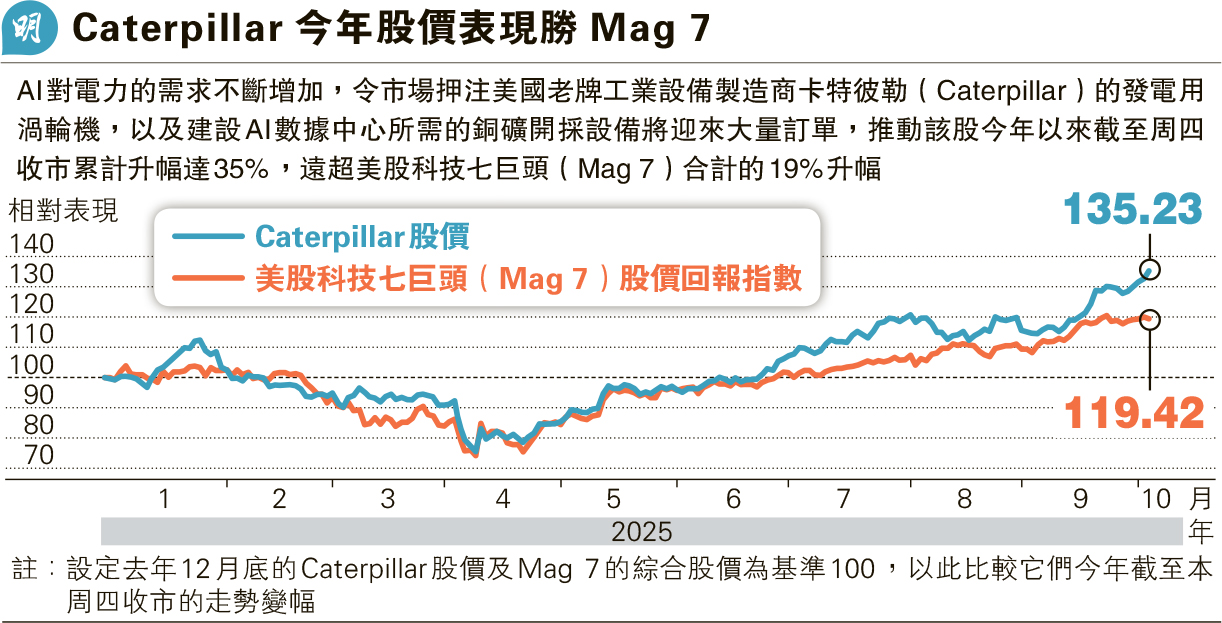 【明報專訊】在AI投資熱潮下,美國老牌工業設備製造商Caterpillar(美:CAT)出乎意料成為股市贏家。由於AI對電力的需求不斷增加,市場押注Caterpillar較鮮為人知的產品——發電用渦輪機可接獲大量訂單,加上建設AI數據中心需要大量銅,料將為該公司的銅礦設備帶來大量需求,刺激該股近期持續上揚,單在9月股價已急升14%,是2023年12月以來最佳的單月表現。該股昨早段漲至497.87美元,刷新歷史高位。截至周四收市,該股今年以來累計升幅達35%,遠超美股科技七巨頭(Mag 7)合計的19%升幅。