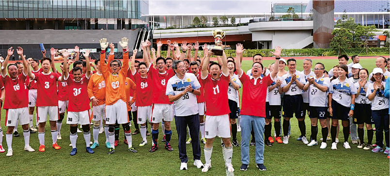 【明報專訊】立法會與政府昨在啟德青年運動場踢足球友誼賽,由特首李家超與立法會主席梁君彥主持開球禮。賽事在3號風球下舉行,李家超形容像行政與立法關係般風雨無阻,為香港未來打拼。梁君彥形容打一場好波與治理香港有許多共通點,領隊要看懂大局,踢波要有隊形,「懂得互相包抄補位」,相信立法會會做好監察和配合政府的工作,「不僅協助『把關』,更樂意『助攻』」。賽事由政府隊以2:1險勝立法會隊,上半場先由土木工程處副處長曹偉雄射入12碼領先,下半場由民建聯陳學鋒的兒子追和,最終財庫局首席助理秘書長王梓傑為政府隊奠定勝局。賽後副律政司長張國鈞(前排中)高舉獎盃,與政務司長陳國基(前排右)等慶祝。