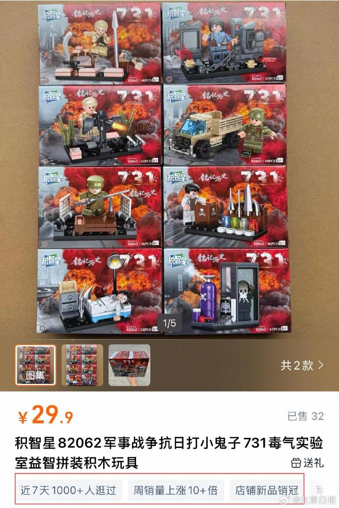 抗戰電影《731》上映之際,內地玩具廠商「積智星」近日在電商平台推出一款「731毒氣實驗室拼裝積木」,遭解放軍旗下媒體「鈞正平」(「軍政評」諧音,意指解放軍政治評論)10月2日發文批評。該款玩具3日下午從電商平台下架。