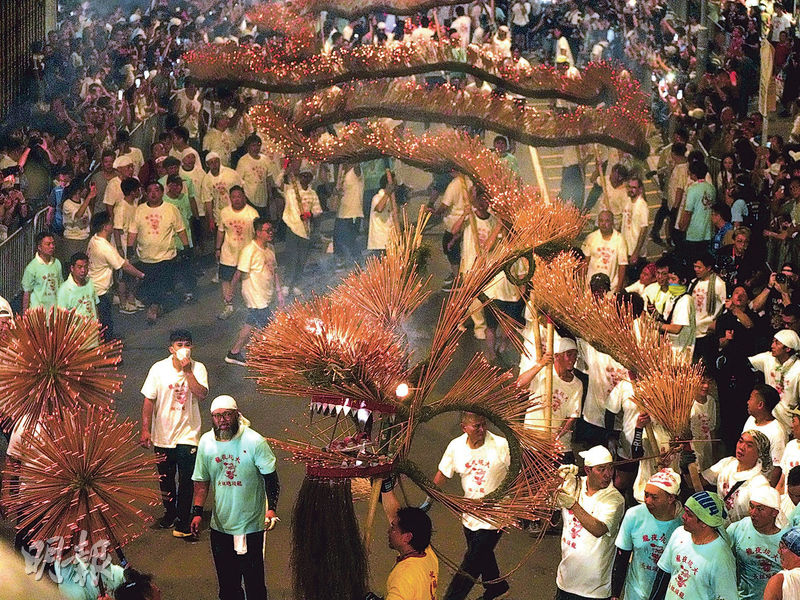 【明報專訊】為期3日的年度盛事「大坑舞火龍」昨晚迎月夜登場,吸引大批市民及遊客到現場觀賞。全長67米的火龍由1.2萬炷長壽線香組成,由300名健兒合力舞動,火龍穿梭於大坑的大街小巷,祈求合境平安。有首次觀賞舞火龍的深圳遊客形容,感受到香港過中秋的濃厚氣氛及「人文感覺」,較深圳主要用無人機及燈光等科技表演的慶中秋活動「更真實」。毗鄰的維園亦正舉行綵燈,亦成為市民和遊客的打卡熱點,而大坑火龍今晚亦會舞入維園,為中秋夜增添氣氛。